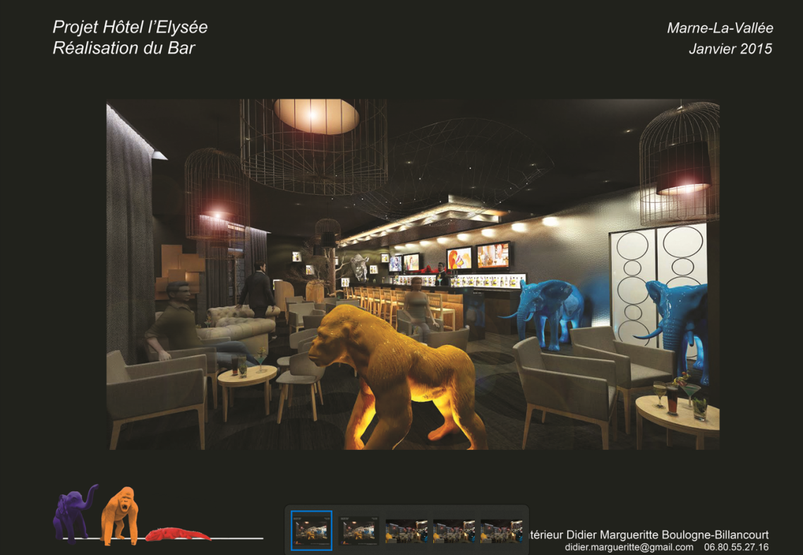 L'ambiance souhaitée était d'être dans un écrain, la réception avec son accueil en chêne et albâtre, son restaurant avec moulures et placage teinté et mobilier chêne et velours, chambre avec placage bois sur l'ensemble et salle de spots avec une ambiance tamisée qui s'accorde avec le reste de l'établissement