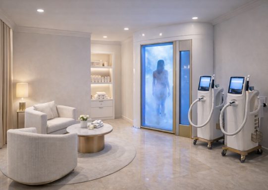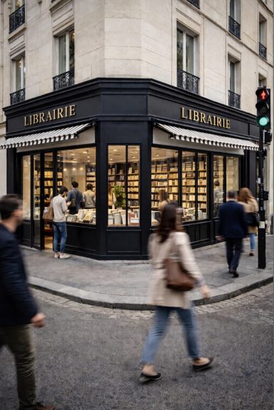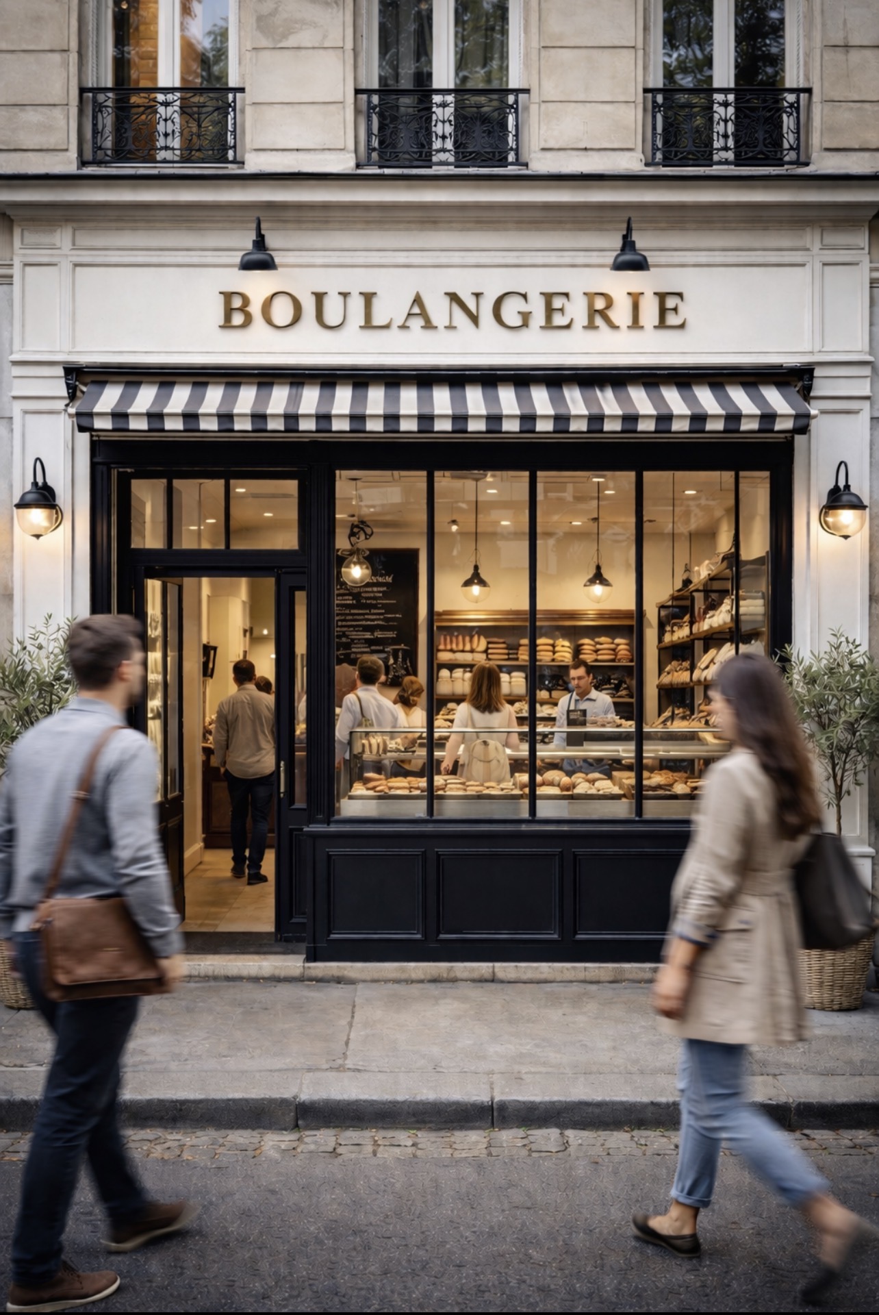 Une salle d'atente pour un cabinet d'avocats, un espace de cryothérapie, une boutique de jeans, une façade de boulangerie patisserie, une façade de bibliothèque et une façade de boulangerie